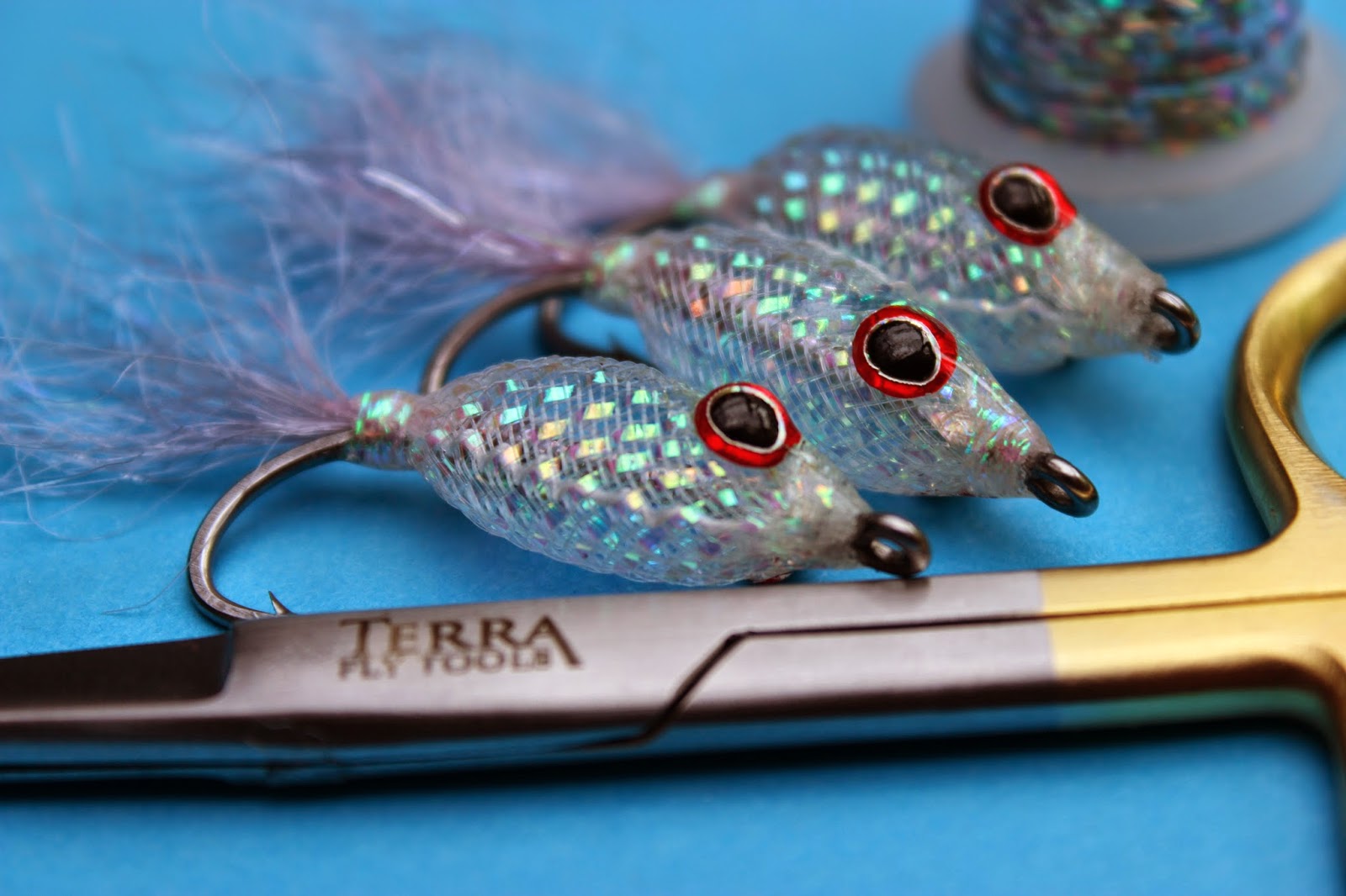 The shank of the hook is wrapped in holographic tinsel which really adds to the appeal of these little gems ! I've also wrapped the thread wraps with some crystal flash to give them extra zing !